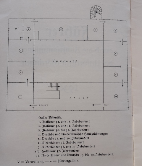 Nicht zufällig erinnert dies verdächtig an die von Herbert von Einem heraufbeschworenen räumlichen Vorbedingungen künstlerischer Formfindung. Und tatsächlich setzte sich die räumlich-völkische Sammlungsordnung in der Kunstsammlung fort. Sind es im völkerkundlichen Ausstellungsteil die Ethnien Afrikas, Ozeaniens oder der Amerikas, deren Artefakte präsentiert werden, so werden die – sämtlich europäischen Kontexten entstammenden – Gemälde der Kunstsammlung nach nationalen Schulen getrennt gezeigt: Den italienischen Gemälden sind die ersten drei Räume gewidmet, der größte Raum ist der deutschen Kunst des 15. und 16. Jahrhunderts vorbehalten, dann folgen in einer Abfolge mehrerer kleiner Räume die niederländischen Gemälde, die den Löwenanteil der Gemäldesammlung ausmachen.15O. V. Führer durch die Kunstsammlung der Universität Göttingen 1936. Erst innerhalb dieser räumlich-nationalen Kategorien findet eine weitere zeitliche Schichtung nach Entstehungszeit der Gemälde statt.